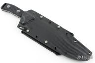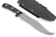 This Arbiter by Microtech features a stonewashed recurve blade with a notched thumbrest and sharpened top edge. The handle has black G-10 scales with blasted hardware. .209" blade thickness and 1.876" blade depth, full tang construction. Butt has a lanyard hole. Comes with kydex sheath with molle locks. Comes with original box and papers. Serial number 3109 and dated 10/2023. Excellent condition.