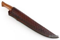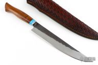 This Knife by MA Knives features a satin finished blade with forge finished flats, visible temper line, .108" blade stock and 1.397" blade depth, hidden tang construction. The handle has a stainless steel guard wood grip with a turquoise spacer. Comes with a hand tooled brown leather sheath. New from maker.