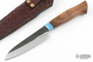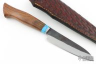 This Knife by MA Knives features a satin finished blade with forge finished flats, visible temper line, .115" blade stock and 1.139" blade depth, hidden tang construction. The handle has a stainless steel guard wood grip with a turquoise spacer. Comes with a hand tooled brown leather sheath. New from maker.