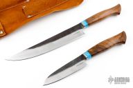 This Knife Set by MA Knives features a slicer and a utility knife. The utility knife has a satin finished blade with forge finished flats, visible temper line, .112" blade stock and 1.166" blade depth, hidden tang construction. The handle has a stainless steel guard wood grip with a turquoise spacer. The slicer knife has a satin finished blade with forge finished flats, visible temper line, .107" blade stock and 1.389" blade depth, hidden tang construction. The handle has a stainless steel guard wood grip with a turquoise spacer. Comes with a brown leather rollup. New from maker.
