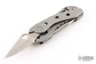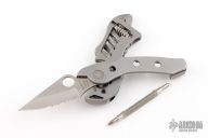 The T01 SpydeRench includes a real Spyderco knife with a locking full-sized, one-hand open/close knife blade and pocket clip. Investment-cast 17-4ph corrosion resistant stainless steel body. Features include: adjustable crescent wrench, a 2-setting slip joint pliers, a set of four screwdriver bits (including: a #2 and #3 Phillips-head as well as a #1 and #2 flat-head), and a diamond-coated file featuring a concave, convex and flat sharpening surface.