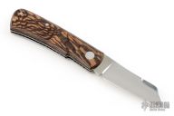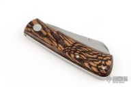This Hitchcock slipjoint by Nick Timpson of Birdvis Knives features a hand rub satin finished blade with nail nick. The handle has Platan wood covers, black liners, stainless steel escutcheon, stainless steel liners and spring. Has half-stop, flush in all positions. Comes with original box, sheath and COA dated 09/2021. Excellent condition.