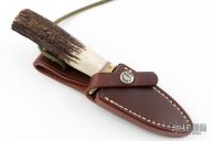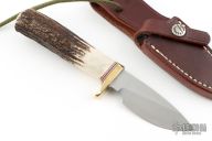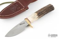 The Model 11 is the original drop point blade. Designed by Tommy Thompson, noted Alaskan guide, in 1952 for big-game skinning, with point dropped below top of blade to prevent cutting too deeply through skins when used point first. The blade is satin finished with a notched thumbrest, .155" blade stock and 1.105" blade depth, hidden tang construction. The handle has a brass guard, stag handle, red/white/blue spacers. Comes brown leather sheath with belt loop. Excellent condition.