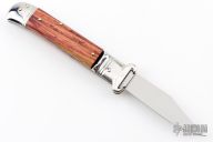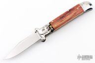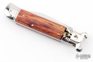 This Lever Lock Auto has a tumble polished blade. Handle has wood scales, stainless steel front and rear bolsters, stainless steel liners and lock release button. Excellent condition. The bolsters have 16 and 12 gauge shot shell pullers.