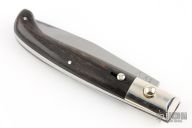 This knife by AGA Campolin features a mirror polished clip point blade. The handle has nickel silver bolsters and button release, wood scales, stainless liners, safety and backspacer. Nice action, nice lockup and blade seating. Excellent condition. Comes with a leather slip sheath. Excellent condition.