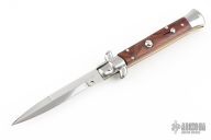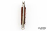 This 9" Swivel Bolster by Frank Beltrame features a polished blade with false top edge. The handle has polished stainless bolsters, front and rear, cocobolo scales, brass liners and stainless steel spring. Comes with a leather slip. Excellent condition. This one has been tuned and polished by Greg Effects.