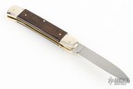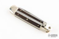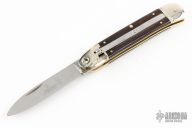 This leverlock auto by Hubertus features a mirror polished blade, nickel silver double bolsters, linen micarta scales, brass liners and brass pins. Opens with a nice snap. Very fast opening. Excellent condition.