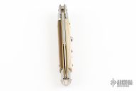 This 9" Swivel Bolster by Frank Beltrame features a polished blade with false top edge. The handle has polished stainless bolsters, front and rear, honey horn scales, brass liners and stainless steel spring. Comes with a leather slip. Excellent condition. This one has been tuned and polished by Greg Effects.