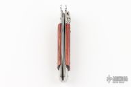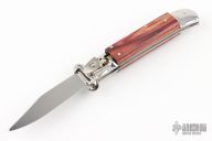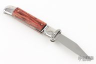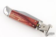 This Lever Lock Auto has a tumble polished blade. Handle has wood scales, stainless steel front and rear bolsters, stainless steel liners and lock release button. Excellent condition. The bolsters have 16 and 12 gauge shot shell pullers.