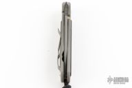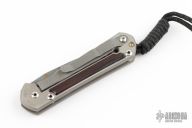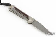 This Small Sebenza 21 by Chris Reeve has a Devin Thomas stainless steel "raindrop" Damascus blade with dual thumbstuds and notched thumbrest. The handle is two-tone bead blasted and satin finished titanium with Madagascar Rosewood inlays, bead blasted tip up clilp, and anodized lanyard pin and barrel spacer. Nice lockup detent, and blade seating. Comes with original box, leather slip sheath and papers.  Dated February 27, 2012. Excellent condition.