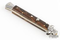 This 11" swivel bolster by Frank Beltrame features a polished blade with false top edge. The handle has polished stainless bolsters, front and rear, wood scales, brass liners and stainless steel spring. Excellent condition. This one has been tuned and polished by Greg Effects.