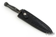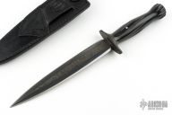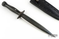 This Fairbairn Sykes Dagger by James Behring features a blued and hammer mark finished double edged blade, .238" blade stock and 1.165" blade depth, hidden tang construction. The handle has a fluted buffalo horn grip. Comes with a hand tooled black leather sheath. Has some patina, otherwise excellent condition.