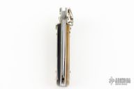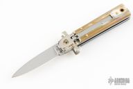 This Mini Dominus Leverlock Auto by AGA Campolin has a stainless steel spear point blade with false top edge. Handle is honey horn with nickel silver bolsters, brass liners, stainless steel backspacer. Comes with a leather slip sheath. Excellent condition.