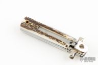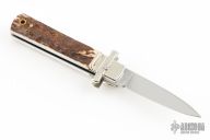 This Mini Dominus Leverlock Auto by AGA Campolin has a stainless steel spear point blade with false top edge. Handle is stag with nickel silver bolsters, brass liners, stainless steel backspacer. Comes with a leather slip sheath. Excellent condition.