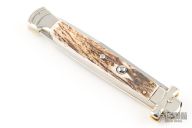 This lockback Auto by AGA Campolin has a mirror polished stainless steel spear point blade with false top edge. The handle has stag scales with mirror polished nickel silver bolsters, brass liners, stainless steel backspacer. Excellent Condition. Comes with a presentation box and a brown leather slip sheath.