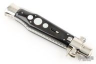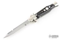 AGA Campolin 11" Blackwidow with Buffalo horn that has mother of pearl inlays. This Campolin made automatic knife has solid nickel silver bolsters with maltese cross in the hilt. To close this one you use the lock back release at rear of the handle. This makes for very tight and stable construction and it's a bit more robust because of that. Has a mirror polished blade with false top edge and fileworked spine. The nickel silver liners and a fileworked stainless steel backspacer. Includes a black leather sheath, COA and wooden presentation box.  Excellent Condition.