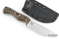 This Nomad Bushcrafter Sabre Grind by Work Tuff Gear features a satin finished Bohler K239 blade with .189" blade stock and 1.159" blade depth, full tang construction. The handle has textured stinger yellow camo grip G-10 scales, exposed pommel and lanyard hole. Comes with box, papers, and  Kydex sheath. New from maker! 09/2024