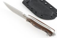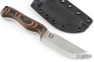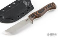 This Nomad Bushcrafter Scandi Grind by Work Tuff Gear features a stonewash finished Bohler K239 blade with .189" blade stock and 1.159" blade depth, full tang construction. The handle has textured tiger camo grip G-10 scales (white liners), exposed pommel and lanyard hole. Comes with box, papers, and  Kydex sheath. New from maker! 09/2024