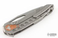 This Sigil MK6 by Microtech Knives features an Apocalyptic finished blade with thumb hole and flipper, notched thumbrest. The handle has an Apocalyptic finished titanium frame, tip up clip and backspacer with a distressed copper overtravel stop, stainless lockface insert. Comes with original box and papers. S/N 0393 and dated 02/2017. Excellent Condition.