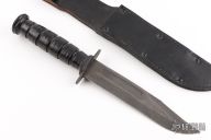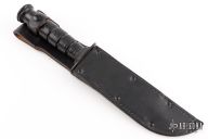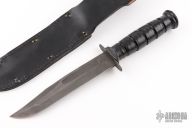 This MK2 by Ontario features a black blade with sharpened top edge and fullers, .174" blade stock and 1.222" blade depth, hidden tang construction. The handle has a black steel guard and butt with a stacked leather grip. Comes with a black leather sheath. Has a few scuffs, otherwise excellent condition.