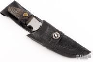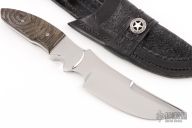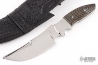 This Skinner by Jerry Kohls features a mirror polished blade with false top edge, .140" blade stock and 1.730" blade depth, full tang construction. The handle has mirror polished stainless steel bolsters, linen micarta scales with mosaic pins and white liners, fileworked tang. Comes with a black hand tooled leather sheath. Has a few light scratches, otherwise excellent condition.
