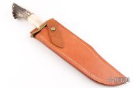This Bowie by Zollan McCarty features a mirror polished blade with a nearly sharpened top edge, .246" blade stock and 2.061" blade depth, hidden tang construction. The handle has a brass guard, crown stag grip with brass spacers. Comes with a brown leather sheath and a zippered case. Has some light scratches, otherwise excellent condition.