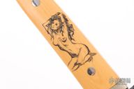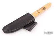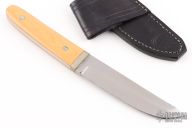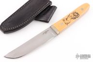 This Tanto from T.W. Downing features a matte finished blade with .242" blade stock and 1.185" blade depth, full tang construction. The handle has a nickel silver guard with yellow paper micarta scales with nude scrimshaw by "BRADY". Comes with a black leather sheath with belt loop and a zippered case. Has some light scratches, otherwise excellent condition.