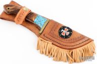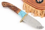 This Skinner by Jerry Kohls features a "Knapped" finished blade with .170" blade stock and 1.542" blade depth, full tang construction. The handle has a brass guard, wood and turquoise scales with mosaic pins and lanyard hole. Comes with a hand tooled brown leather sheath with a beaded inlay. Has a few light scratches, but otherwise in excellent condition.