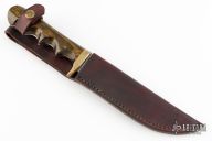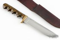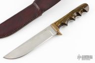 This knife by "BRJ" (please let us know if you know who this is) features a mirror polished blade with fileworked spine, .167" blade stock and 1.260" blade depth, full tang construction. The handle has a brass guard and dymondwood scales. Coems with a black leather sheath. #939 on the blade. Has a few light scratches, otherwise excellent condition.