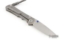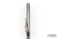 This Large Inkosi from Chris Reeve Knives features a tumble finished drop point blade with dual anodized thumb studs and notched thumbrest. The handle is comprised of a bead blasted and laser engraved titanium frame over a single barrel spacer with a matching bead blasted titanium tip up clip. Includes original box, paperwork and accessories. Excellent condition. Maker's card dated July 19, 2022.