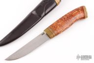 This Scandanavian Alpine Companion by Pentti Turunen features a satin finished blade with .211" blade stock and .914" blade depth, hidden tang construction. The handle has a brass guard, beautiful burl wood grip with red and brass spacers, walrus ivory butt. Comes with a black leather sheath with brass collar. Has some patina, otherwise excellent condition.