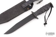This knife by Ontario features a black blade with sharpened top edge, .189" blade stock and 1.384" blade depth, hidden tang construction. Rubber handle with a lanyard hole. Comes with original nylon sheath and box. Excellent condition.