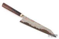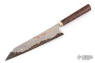 This Gyuto by Forester Knives San Mai Damascus flat ground blade with Mokume cladding (brass and copper) and a V-Toku2 core, .117" blade stock and 1.839" blade depth, hidden tang construction. The handle has a mokume guard with a textured ironwood grip. New from maker! 65hrc