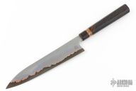 This Petty by Forester Knives San Mai Damascus flat ground blade with hammered stainless steel and copper cladding and a V-Toku2 core, .090" blade stock and 1.512" blade depth, hidden tang construction. The handle has a textured ironwood grip with a mammoth ivory and copper spacers. New from maker! 65hrc