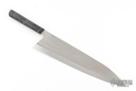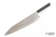 This Gyuto by Forester Knives features a two-tone blade with small fullers for food release, hand rub satin finished grinds and bead blasted flats and fullers, .107" blade stock and 2.792" blade depth, hidden tang construction. The handle has a marble carbon fiber grip. New from maker! 63hrc