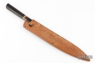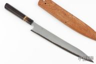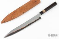 This Yanagiba by Forester Knives San Mai Damascus single bevel blade with stainless steel and copper cladding and a V-Toku2 core, .106" blade stock and 1.501" blade depth, hidden tang construction. The handle has a stabilized bog oak grip with a mammoth tooth and copper spacers. New from maker! 65hrc Comes with a wooden saya with a mammoth tooth retention pin.