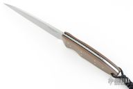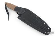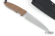This knife by David Lancaster Clark features a satin finished blade with false top edge, .166" blade stock and 1.465" blade depth, full tang construction. The handle has brown G-10 scales with brass pins and lanyard hole, black liners and a fileworked tang. Comes with a kydex sheath. New from maker.