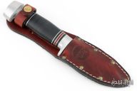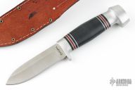This knife by Remington features a satin finished drop point blade with a hidden tang construction.  .133" Blade Stock.  1.013" Blade Depth.  The handle features an aluminum guard and butt with a stacked black micarta grip.  Includes a brown leather sheath and original box. Excellent Condition.