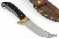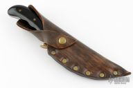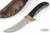 This Kalinga by Buck Knives features a satin finished upswept blade, .177" blade stock and 1.228" blade depth, full tang construction. The handle has brass guard, black linen micarta scales with brass pins. Comes with a brown leather sheath, and display box. Has some scratches and patina. Great condition otherwise.