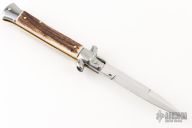 This Swivel Bolster features a 4mm bayonet ground blade. The handle has stainless steel bolsters and pommel with stag scales over brass liners and stainless steel backspacer. Excellent Condition. Comes with a leather slip sheath.