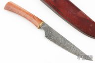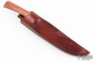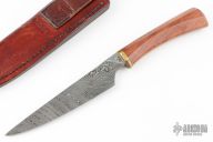 This knife by Master Smith C Robbin Hudson features a Damascus blade with .237" blade stock and 1.185" blade stock, hidden tang construction. The handle has a nicely shaped octagonal curly maple wood grip with brass collar. Comes with a brown leather sheath. Has some patina on the collar otherwise Excellent condition.