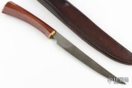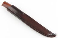 This knife by Master Smith C Robbin Hudson features an up swept blade with .192" blade stock and .819" blade stock, hidden tang construction. The handle has a nicely shaped octagonal wood grip with brass collar. Comes with a brown leather sheath. Has some patina on the collar, patina on the blade, and some scuffs and scratches. Great condition otherwise.