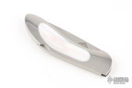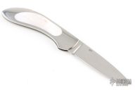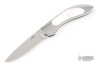 This Interframe Lockback from Warren Osborne features a hand rub satin finished blade with nail nick. The handle has a mirror polished stainless steel frame with mother of pearl inlays. Includes a felt case. Excellent condition. #027