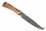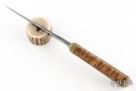 This knife by Master Smith C Robbin Hudson features a Damascus blade with .256" blade stock and .976" blade stock, hidden tang construction. The handle has a nicely shaped octagonal curly maple wood grip with brass collar. Has some patina on the collar otherwise Excellent condition.