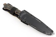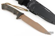 This Spartan-Harsey from Spartan Blades features a flat dark earth coated clip point blade with false top edge, .187" blade stock and 1.560" blade depth, full tang construction. The handle has black canvas micarta scales with notched thumb ramp and exposed tang pommel and lanyard hole with lanyard. Includes Kydex sheath with nylon belt loop. Excellent conditon. Comes with a 2010-2011 Spartan Blades Catalog.