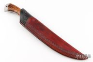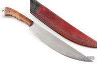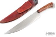 This Camp Knife by Matt Lamey features a hand rub satin finished convex ground blade with .184" blade stock and 1.862" blade depth, full tang construction. The handle has curly maple scales. Comes with a hand tooled brown leather sheath. Has some scratches, has been sharpened, otherwise good condition. This knife has been rehandled, and the blade profile changed.