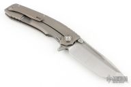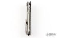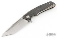blade with swedge, fuller, notched thumb rest and dual thumb studs with a tritium insert on the "A" side stud. The handle is comprised of a textured carbon fiber scale over a machined titanium liner on the "A" side and titanium lockside with matching tip up clip with tritium insert. Matching backspacer with integrated lanyard bail. Comes with a zipper case. Excellent condition.