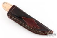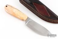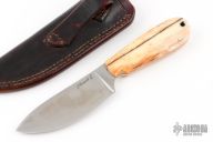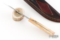 This Skinner from Master Smith Jim Crowell features a satin finished blade with .115" blade stock and 1.420" blade depth, full tapered tang construction. The handle has a camel bone scales with domed sterling silver pins and a lanyard hole. Includes a brown leather sheath. Has some light scratches, otherwise excellent condition. Bascoware Steel