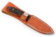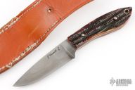 This small hunter from Master Smith Jim Crowell features a hand rub satin finished blade with nice gamon, .097" blade stock and 1.027" blade depth, full tapered tang construction. The handle has amber jigged bone scales with domed nickel silver pins and a lanyard hole. Includes a brown leather sheath. Has some light scratches, otherwise excellent condition.