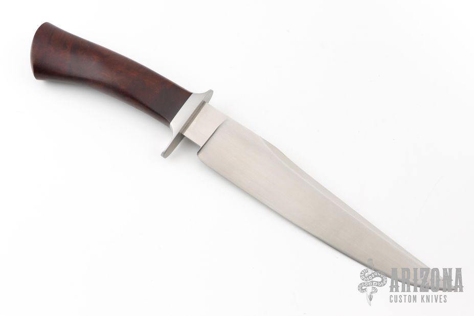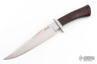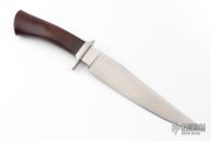 This Bowie by Master Smith Jim Crowell features a hand rub satin finished blade with nearly sharpened top edge, .165" blade stock, 1.483" blade depth, hidden tang construction. The handle has a stainless steel guard with a desert ironwood burl grip. Excellent condition.